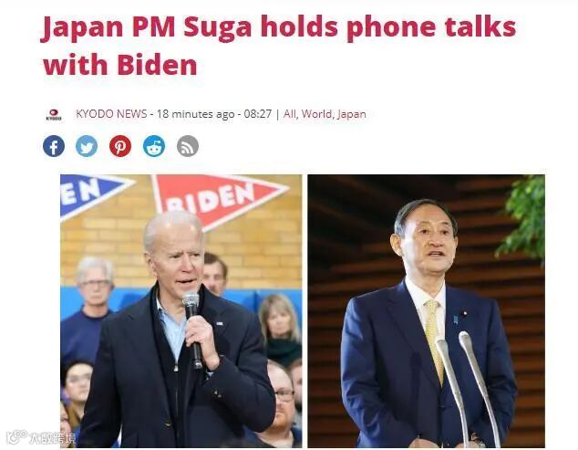 据日本共同社援引政府消息人士消息称,日本首相菅义伟在今天上午与拜登进行首次电话会谈。