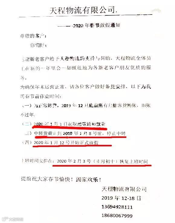 发布2020年春节放假通知称:2020年1月1日起取消等通知放货;中转货截止2020年1月8号前,停止中转,2020年1月12号开始放假。