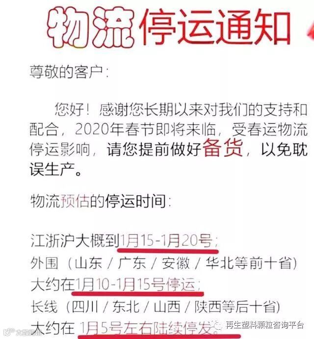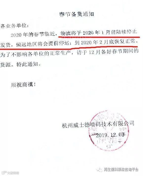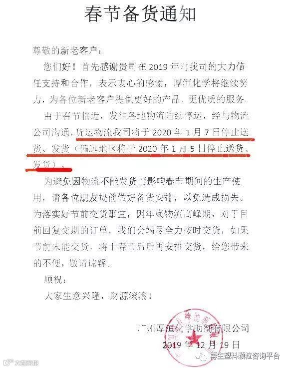 有部分厂家已经开始停止接单送货,发布春节备货通知:广州厚洹化学助剂有限公司发布春节备货通知称:由于春节临近,发往各地物流陆续停运,经与物流公司沟通,货运物流将于2020年1月7日停止送货、发货(偏远地区将于2020年1月5日停止送货、发货)。