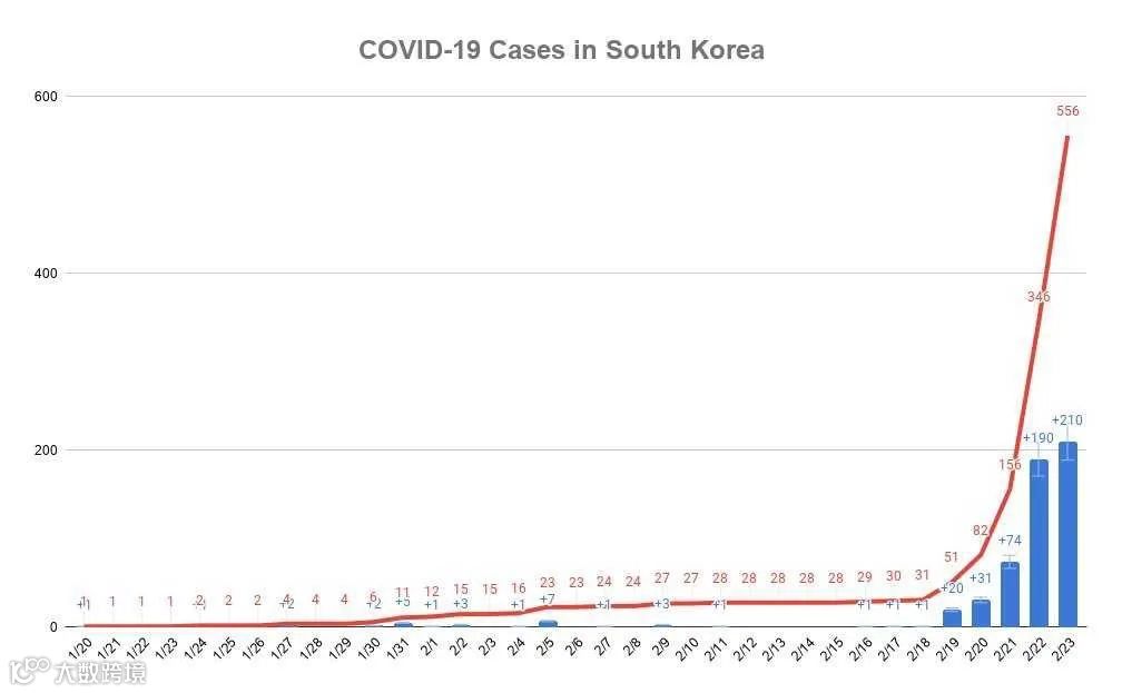 韩国确诊人数正坐上火箭狂飙。