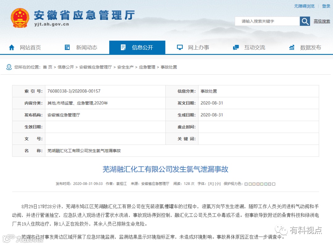 市鸠江区芜湖融汇化工有限公司在充装液氯槽罐车的过程中,液氯万向节发生泄漏,随即工作人员关闭进料气动阀和手动阀,并进行管道抽空,应急队进入现场进行雾状水洗消,事故现场得到控制,融汇化工公司无员工中毒或不适。但事故导致附近的桑青科技和绿洲电厂共19人住院治疗,除1人正在抢救外,其余人员已排除生命危险。