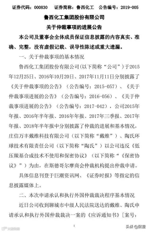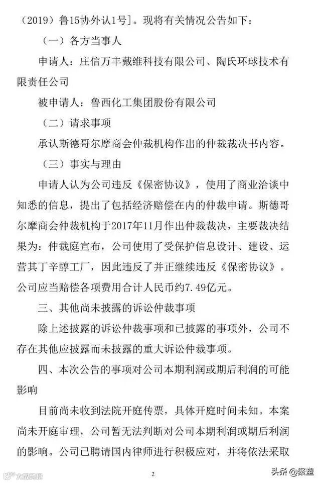 2、斯德哥尔摩商会仲裁机构裁决:鲁西化工赔偿约7.49亿元人民币