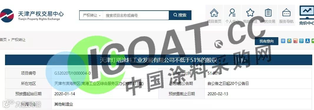 近日,天津产权交易中心披露,天津灯塔涂料工业发展有限公司(以下简称“灯塔涂料”)拟转让不低于51%的股权。