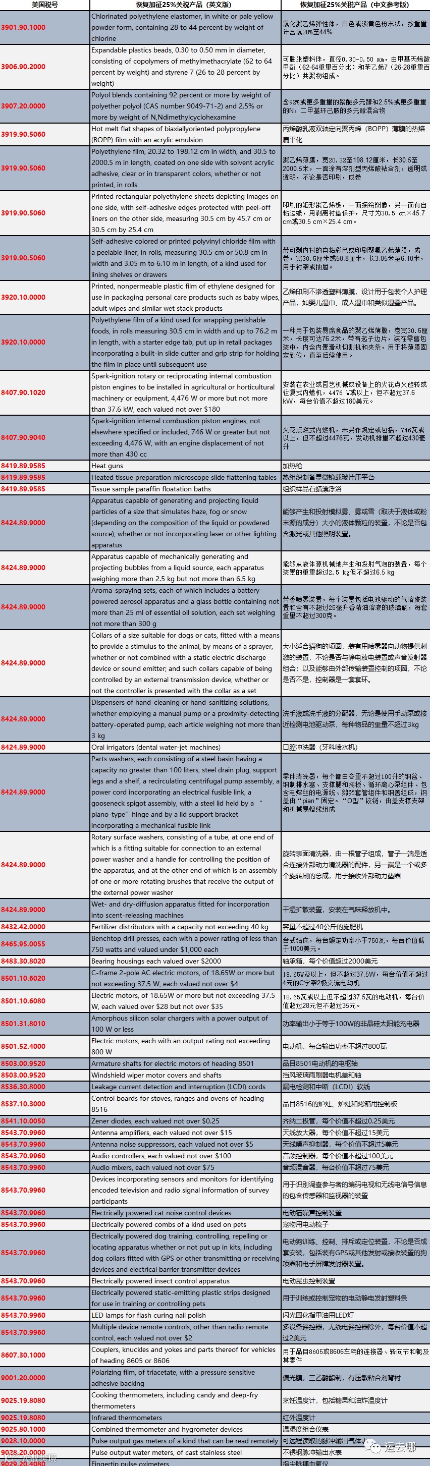 此次没有在排除名单内商品共涉及28个税号下55个品项的商品,恢复加征25%关税,名单如下: