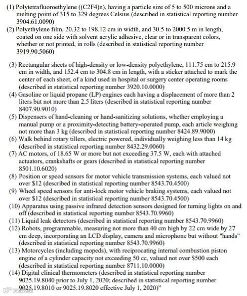 2019年7月31日针对160亿第七次排除清单共涉及34个税号69个品项的商品。此次未获得延长有效期的包括28个税号下55个品项的商品,将于2020年7月31日到期后,被移出排除清单。即2018年8月23日至2020年7月31日期间,这些商品可免加征关税,但从2020年7月31日起,恢复额外加征关税25%。