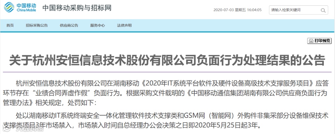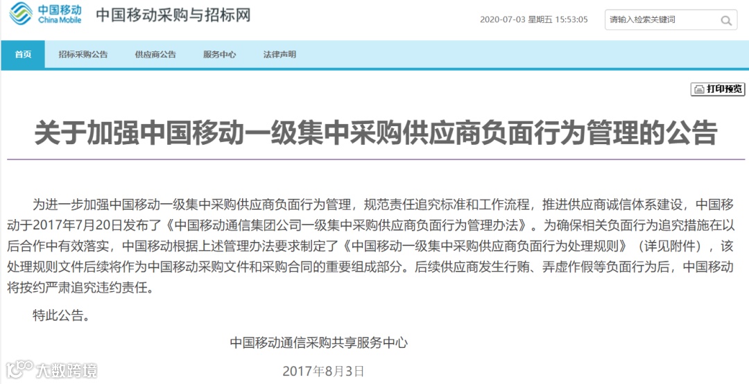 根据该网站信息,一采供应商负面行为公告,所涉及的采购项目均为移动总部直接招投标。截至7月3日下午,今年以来共计发布29份。