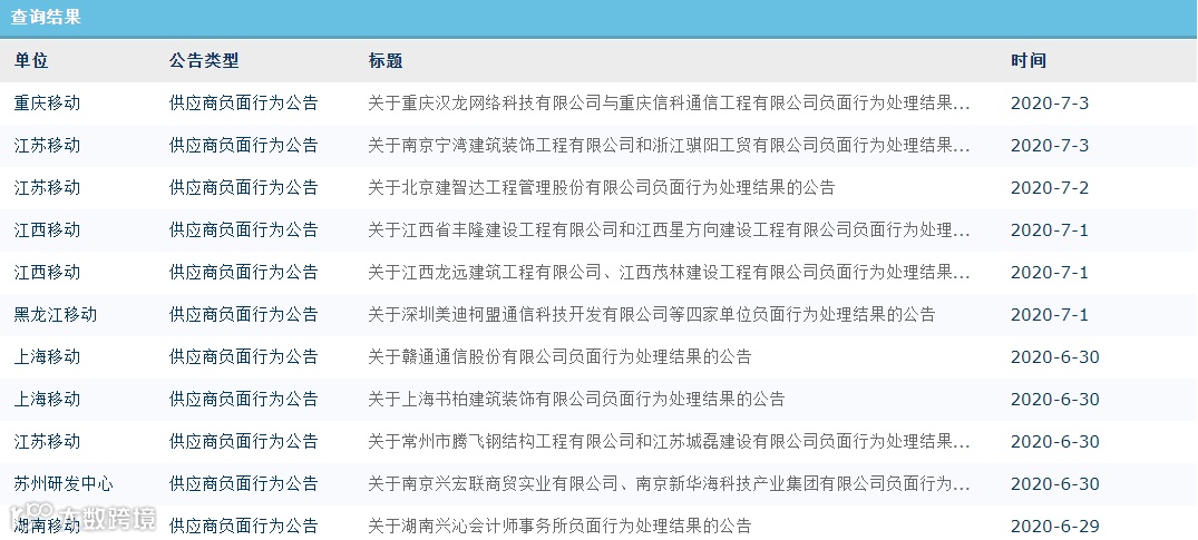 二采供应商负面行为公告,涉及的是各省级移动公司、研发中心、设计院等招投标采购项目。截至7月3日下午,今年以来共计发布351份。