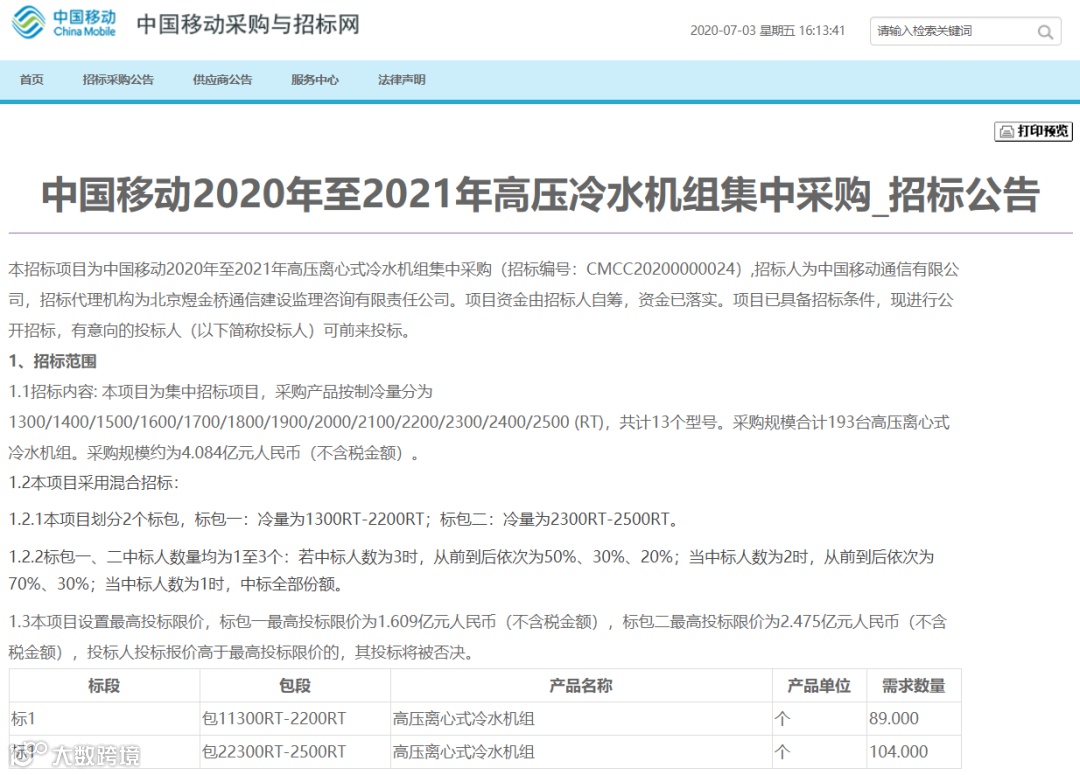 每经小编(微信号:nbdnews)注意到,此次项目为中国移动2020年至2021年高压离心式冷水机组集中采购项目。2020年2月,项目招标公告发布,其中显示此次采购规模合计193台高压冷水机组,采购规模约为4.084亿元(不含税金额),采用混合招标,划分为2个标包,当中标人数为2时,从前到后中标份额依次为70%、30%,当中标人数为1时,中标全部份额,标包1的最高投标限价为1.609亿元(不含税金额),标包2的最高投标限价为2.475亿元(不含税金额)。