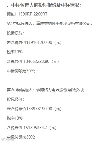 2020年3月,采购中标候选人公示,2个标包的中标候选人为重庆美的通用制冷设备有限公司(简称“重庆美的”)与格力电器。公示显示,此次集中采购中重庆美的投标报价较低,标包1、2的不含税报价分别为11916.12万元、16509.17万元;格力电器的投标报价较高,分别为13397.82万元、18799.05万元。最终两个标包重庆美的均中70%的份额,格力电器均中30%的份额。