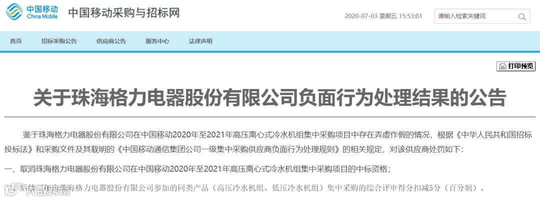 然而,6月1日,中国移动发布公告,称格力电器在该项目中存在弄虚作假的情况,取消格力电器的该项目中标资格,重庆美的将中标该项目的全部份额。