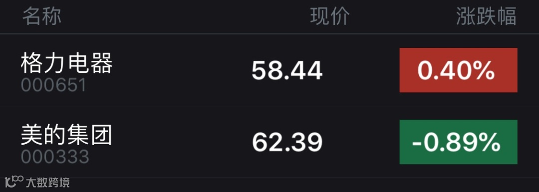 截至今天(7月3日)收盘,格力电器股价收涨0.40%,而美的集团收跌0.89%。