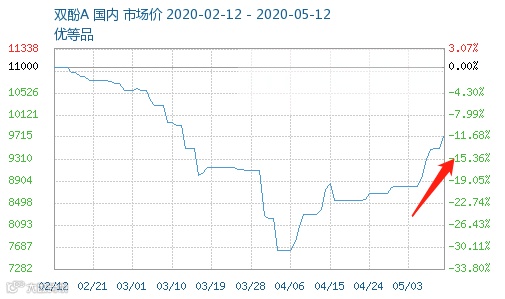5月假期后,双酚A直线拉升,大涨近千元。5月12日,双酚A报价暂稳,中石化三菱报盘10000元/吨。