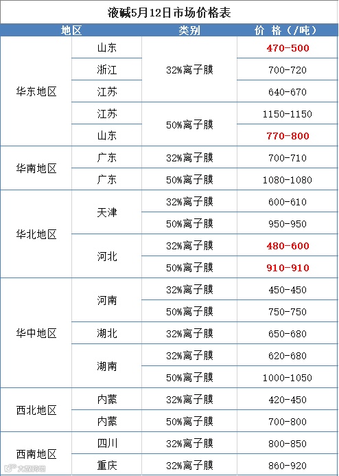 另一边,液碱价格也在上调,5月12日,部分液碱价格如下:
