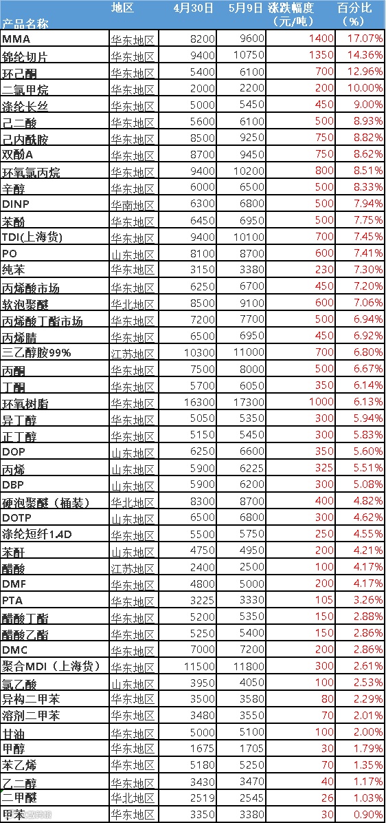 今年一季度,化工价格普跌。甚至有厂家坦言跌到生意无法做(疫情+库存积压)。进入5月,化工市场终于一扫阴霾,凭借五一需求回暖,打响反弹战!
