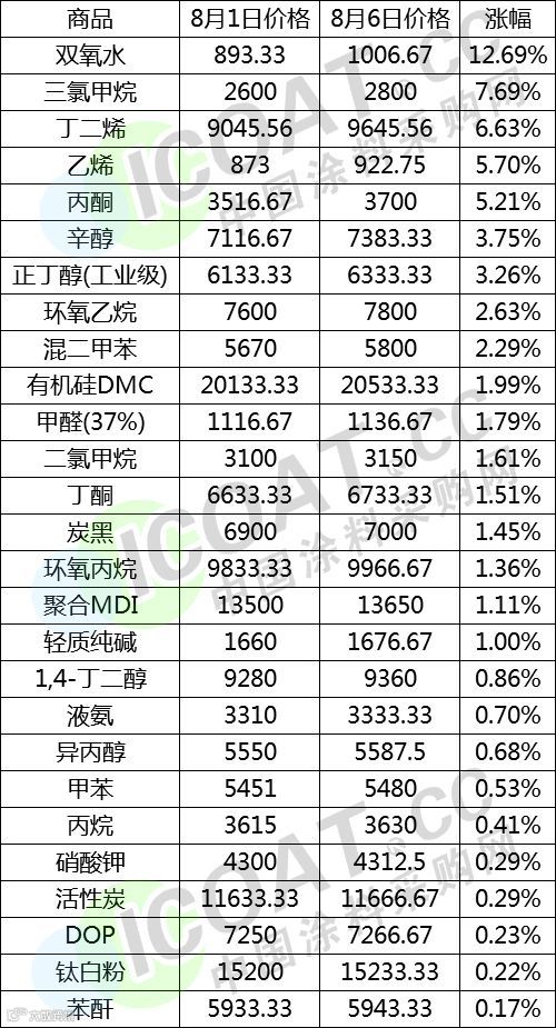据涂料采购网统计,自8月初以来,有27种原材料出现了价格上涨,其中位列第一的是双氧水,涨幅高达12.69%,三氯甲烷而丁二烯紧随其后,涨幅分别为7.69%和6.63%。