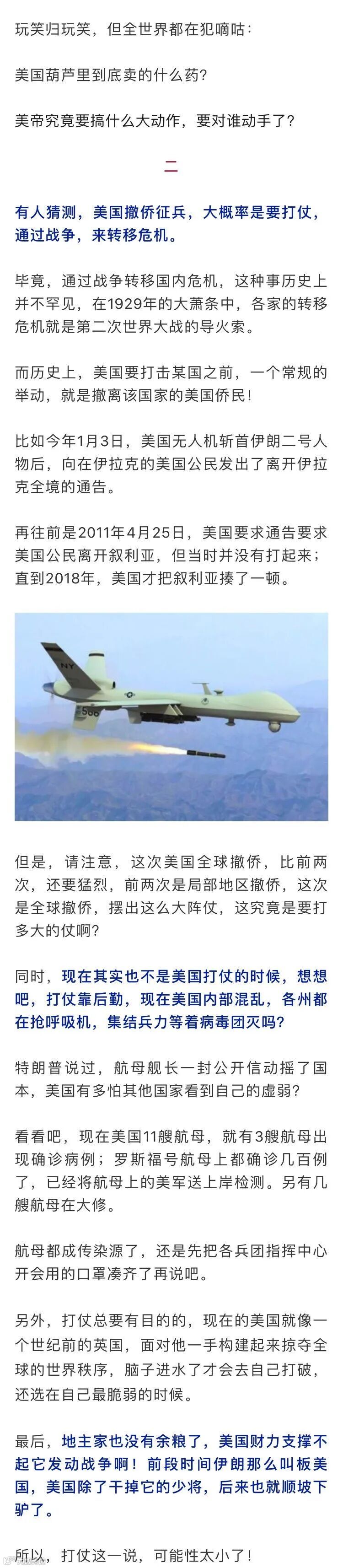 2、美国召回国民,封国断航,另一方面,应该是美国担心它的敌人,趁自己本土爆发疫情,无暇他顾,乘机攻击海外的美国人。