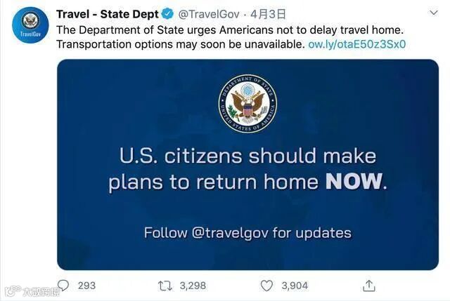 4月3日,美国国务院领事事务局发布推文:呼吁在海外的美国人尽快回国,而且非常急迫,用的单词是:NOW,还特意用大写标粗!