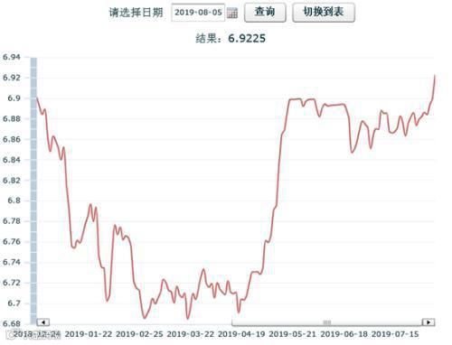 8月5日9时15分出炉的人民币兑美元中间价跌穿6.92关口,报6.9225,较前一交易日下调229点,为去年12月以来首次跌破6.90关口。