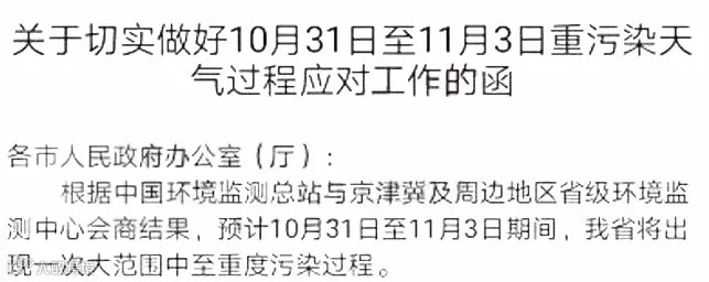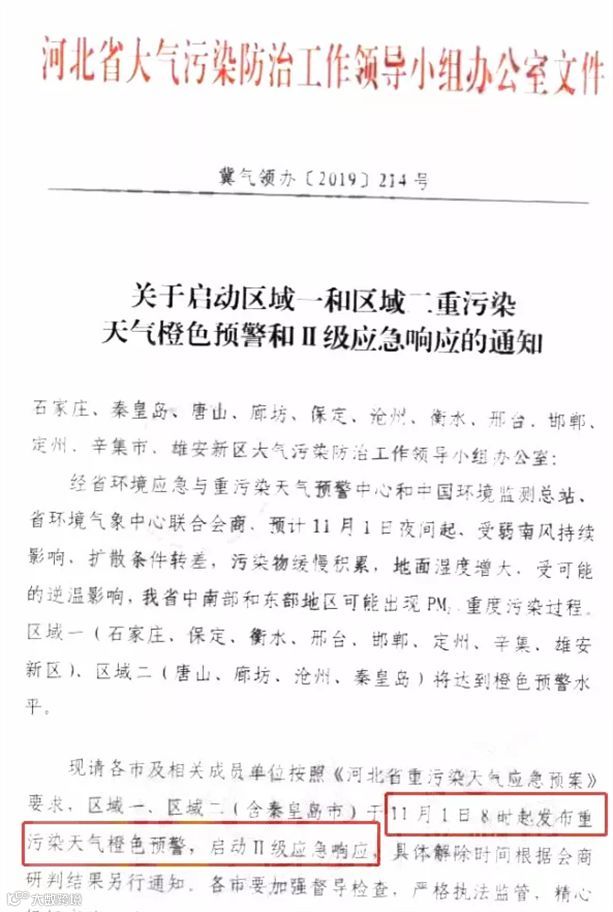 发布了发布关于启动区域一和区域二重污染天气橙色预警和Ⅱ级应急响应的通知,称区域一(石家庄、保定、衡水、邢台、邯郸、定州、辛集、雄安新区)、区域二(唐山、廊坊、沧州、秦皇岛)将达到橙色预警水平。要求区域一、区域二(含秦皇岛市)于11月1日8时起发布重污染天气橙色预警,启动Ⅱ级应急响应。