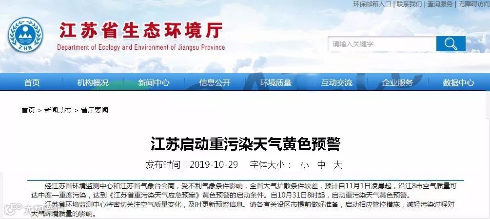 称南京、无锡、常州、苏州、南通、扬州、镇江、泰州等8个沿江城市空气质量可达中度—重度污染,达到《江苏省重污染天气应急预案》黄色预警的启动条件。自10月31日8时起,启动重污染天气黄色预警。