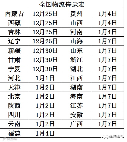 上海、安徽、内蒙古等27个省份地区春节期间物流停运通知。