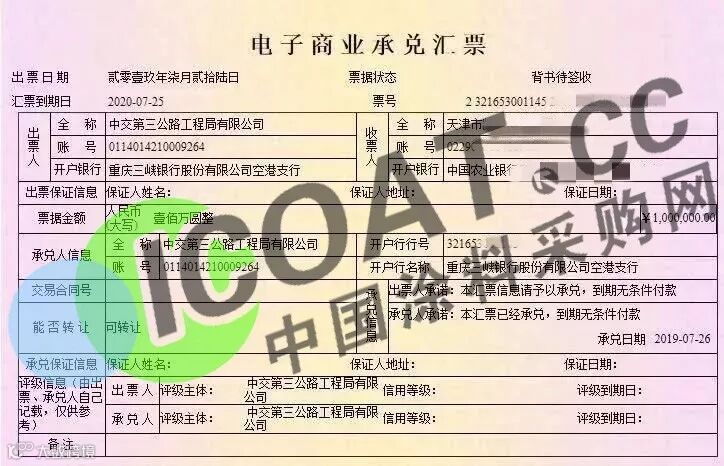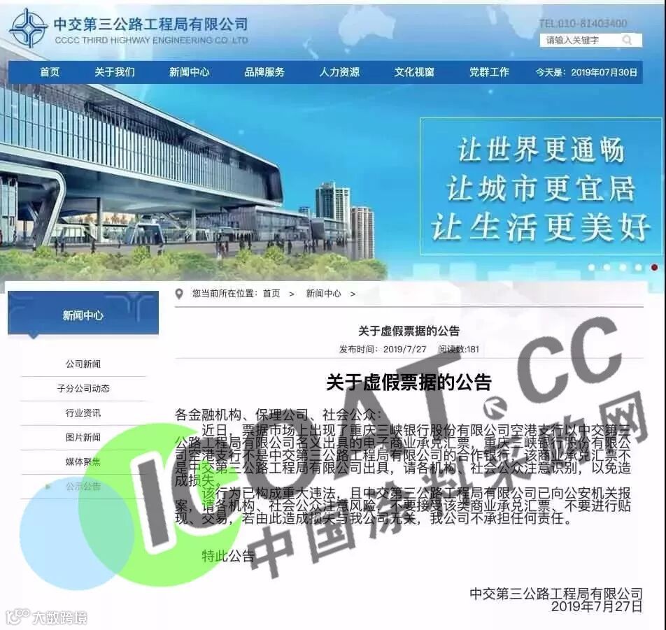7月27日,中交第三公路工程局有限公司发布公告称,近日票据市场上出现了重庆三峡银行股份有限公司空港支行以中交第三公路工程局有限公司名义出具的电子商业承兑汇票,重庆三峡银行股份有限公司空港支行不是中交第三公路工程局有限公司的合作银行。该商业承兑汇票不是中交第三公路工程局有限公司出具。中交第三公路工程局有限公司已向公安机关报案,请各机构、社会公众注意风险,不要接受该类商业承兑汇票、不要进行贴现、交易。