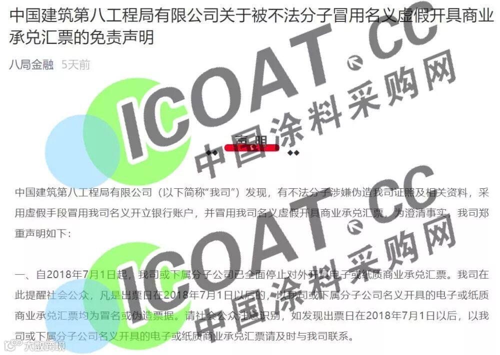 10月29日,中建八局发布声明称,有不法分子涉嫌伪造中建八局证照及相关资料,采用虚假手段冒用中建八局名义开立银行账户,并冒用八局名义虚假开具商业承兑汇票,自2018年7月1日起,中建八局或下属分子公司已全面停止对外开具电子或纸质商业承兑汇票。凡是出票日在2018年7月1日以后的,以中建八局或下属分子公司名义开具的电子或纸质商业承兑汇票均为冒名或伪造票据。