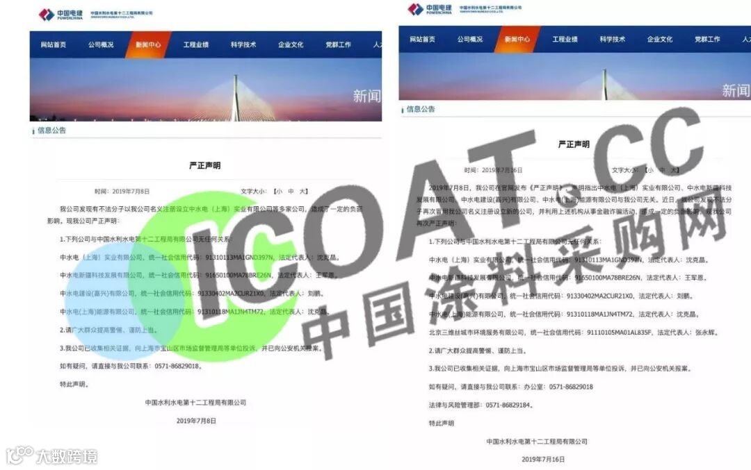 7月8日及16日,中国水利水电第十二工程局有限公司连续发布声明,其发现被人冒充名义注册设立“中水电(上海)实业有限公司”等多家公司并开出票据造成负面影响,在声明中指出这批公司与之无任何关联,且已向公安机关报案。
