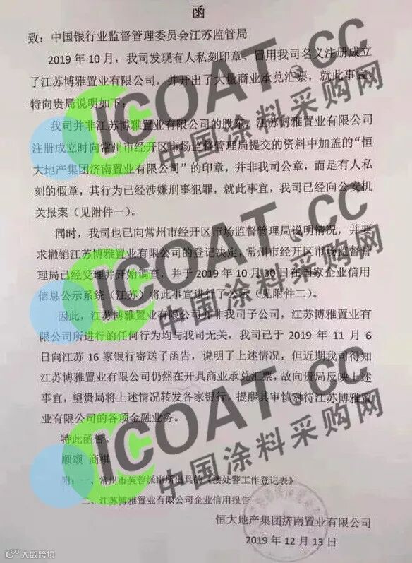 江苏常州银保监分局于2020年1月3日向辖内银行机构发布风险提示函称,兹有恒大地产集团济南置业有限公司提出有人私刻印章、冒用其公司名义注册成立了江苏博雅置业有限公司,并开具了大量商业承兑汇票,提醒辖内各银行机构审慎对待“江苏博雅置业有限公司”的各项金融业务。