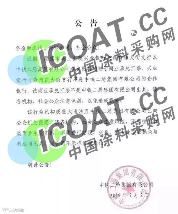 7月2日,中铁二局发布公告,称票据市场上出现兴业银行长春前进大街支行以中铁二局集团有限公司名义出具的电子商业承兑汇票,兴业银行长春前进大街支行不是中铁二局集团有限公司的合作银行,该商业承兑汇票不是中铁二局集团有限公司出具。目前中铁二局已经确认,此批兴业银行长春前进大街支行开出来的全是假票,局总部已经报经侦。