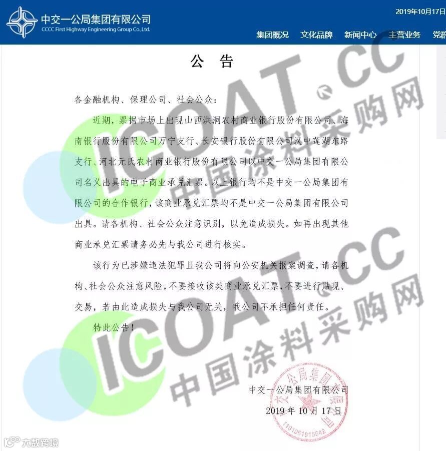 10月17日,中交一公局集团有限公司发布公告称,票据市场上出现山西洪洞农村商业银行股份有限公司、海南银行股份有限公司万宁支行、长安银行股份有限公司汉中莲湖东路支行、河北元氏农村商业银行股份有限公司以中交一公局集团有限公司名义出具的电子商业承兑汇票。以上银行均不是中交一公局集团有限公司的合作银行,该商业承兑汇票均不是中交一公局集团有限公司出具。该行为已涉嫌违法犯罪且我公司将向公安机关报案调查,请各机构、社会公众注意风险,不要接收该类商业承兑汇票,不要进行贴现、交易。