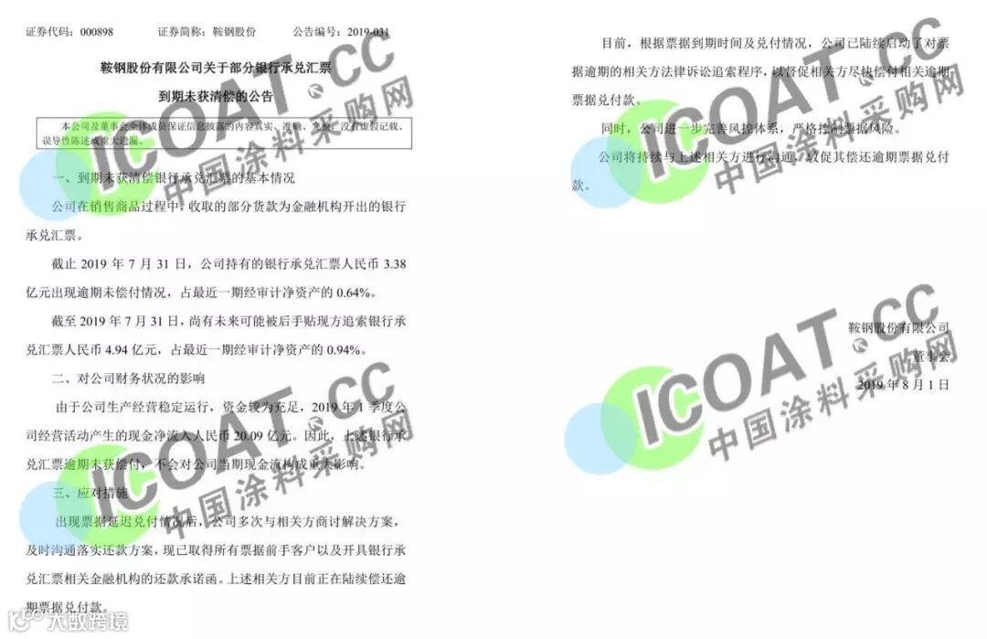 8月1日,鞍钢股份披露了一份公告,截至7月31日,持有的银行承兑汇票人民币3.38亿元,出现逾期未偿付情况,占最近一期经审计净资产的0.64%;截至2019年7月31日,尚有未来可能被后手贴现方追索银行承兑汇票人民币4.94亿元,占最近一期经审计净资产的0.94%,两者银行承兑票据合计8.32亿元。