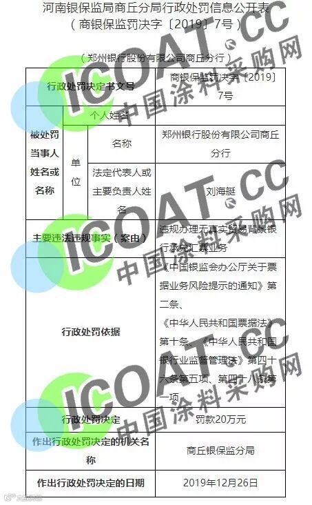 1月2日,河南银保监局商丘分局称,郑州银行股份有限公司商丘分行存在违规办理无真实贸易背景银行承兑汇票业务的行为。河南银保监局商丘分局决定对郑州银行股份有限公司商丘分行罚款20万元。