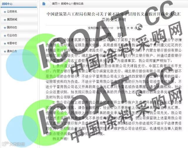 11月12日,中建六局发布声明称,近期,中建六局发现有不法分子涉嫌伪造印章、证照及相关资料,采用虚假手段冒用名义于贵州遵义红花岗农村商业银行股份有限公司天津路支行、中国工商银行乐平支行、内蒙古银行股份有限公司哈尔滨宣化街支行、湖北银行股份有限公司来凤支行开立银行账户,并通过虚假银行账户冒用中建六局名义虚假开具商业承兑汇票。以上企业都不是合作银行,不法分子冒用中建六局名义在上述四家银行开立账户所用的印鉴、证照等资料均为伪造,请各金融机构、社会公众不要接收上述虚假开具的商业承兑汇票。