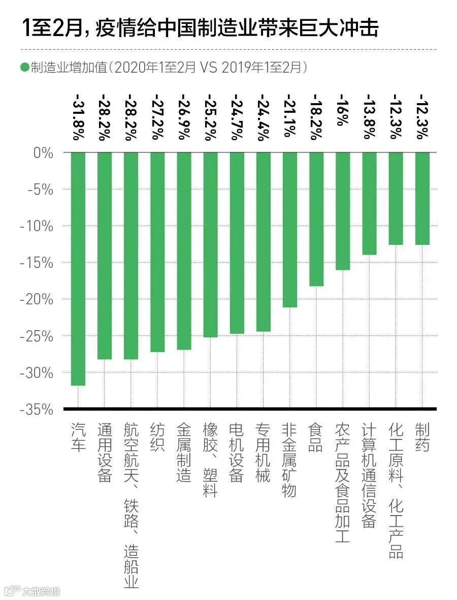 疫情对制造业的影响几乎是全面的。根据国家数据统计,我国1-2月制造业增速全面下滑。其中,汽车、纺织、橡胶尤为严重。而制造业是环环相扣的,汽车行业技术复杂,与橡胶及塑料制品、金属制品和化学原料等行业直接相关。