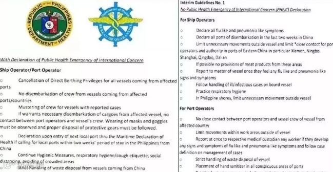 2月3日,菲律宾卫生部发布公告,在所有港口,将对来自中国等新型冠状病毒高发国家的船舶,采取一系列管控措施!以避免病毒通过船舶等形式输入菲律宾。