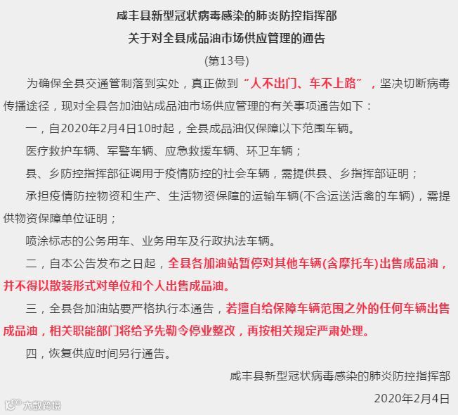 2月4日湖北省恩施土家族苗族自治州咸丰县新型冠状病毒感染的肺炎疫情防控指挥部发布的最新通告显示,该县从4日上午10时起,对4类车辆以外的普通车辆及个人,实行“断油”措施。