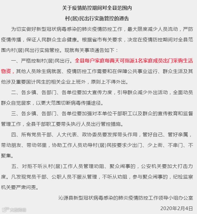 通告中表示,为确保全县交通管制落到实处,真正做到“人不出门、车不上路”,坚决切断病毒传播途径。