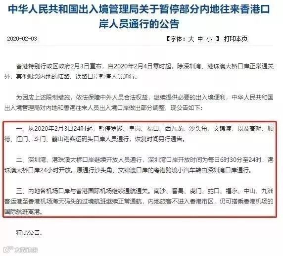 2月3日,中华人民共和国出入境管理局发布关于暂停部分内地往来香港口岸人员通行的公告: