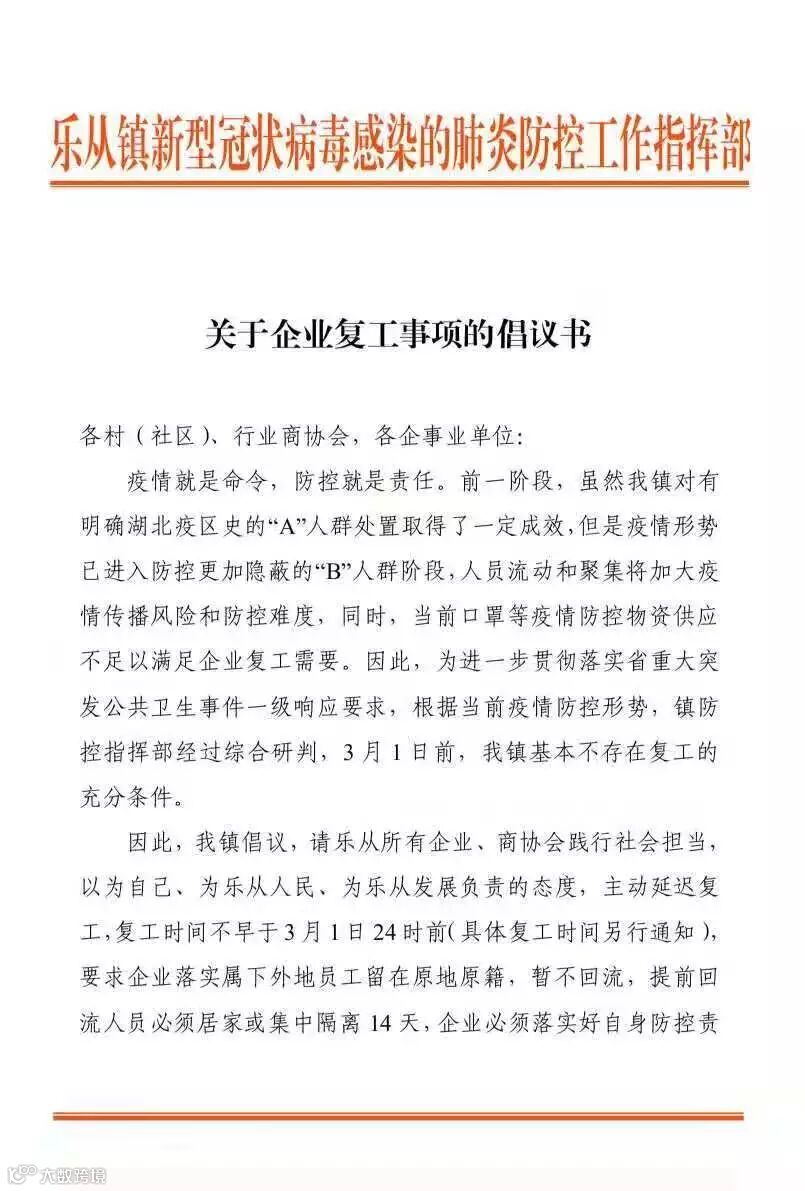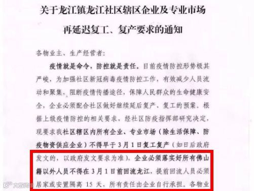 广东佛山顺德区龙江镇,定于3月1日后方可申请复工;凡在3月1日前回流至龙江的所有异地务工人员(非佛山市籍)必须居家或安置隔离15天;要求各业主、生产经营者需通知员工3月1日后方可返回工作地!