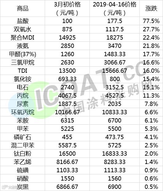 染料中间体的大幅上涨,影响的是整个化工产业链,部分原材料自3月以来一直持续处于上涨状态,以下为部分化工原材料3月初至今价格涨幅榜: