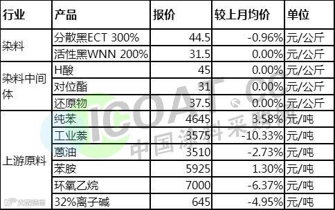 部分染料、染料中间体、上游原材料价格变动如下: