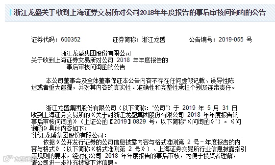 对此,浙江龙盛表示,鉴于《问询函》中涉及事项较多,部分事项需要进一步核实和完善并且需要年审会计师发表意见,公司将延期回复上交所对2018年年报事后审核的《问询函》。《问询函》显示,上交所共问询了8个问题,主要聚焦公司财务数据与经营情况。