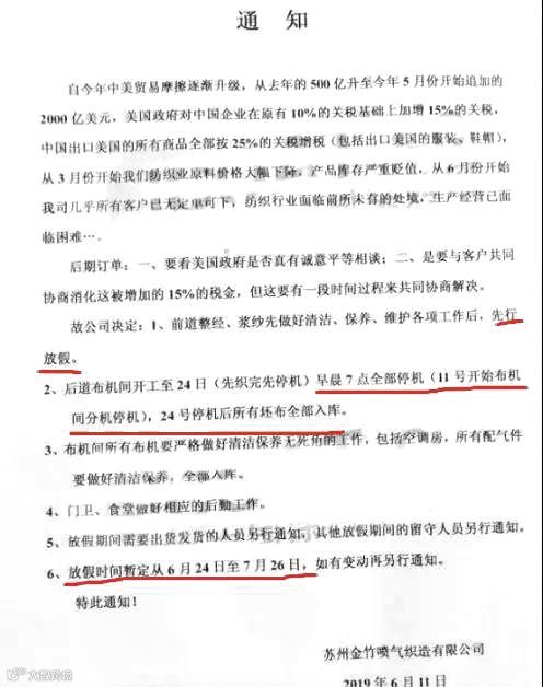 近日,苏州某纺织企业发布通知称,从3月份开始我们纺织业原料价格大幅下降,产品库存严重贬值,从6月份开始该公司几乎所有客户已无定向单可下,纺织行业面临前所未有的处境,生产经营已面临困难,因此,经该公司高层研究决定,自11日起,11号、24号停机后所有坯布全部入库,所有配件全部入库,自6月24日至7月26日放假,如有变动再另行通知。