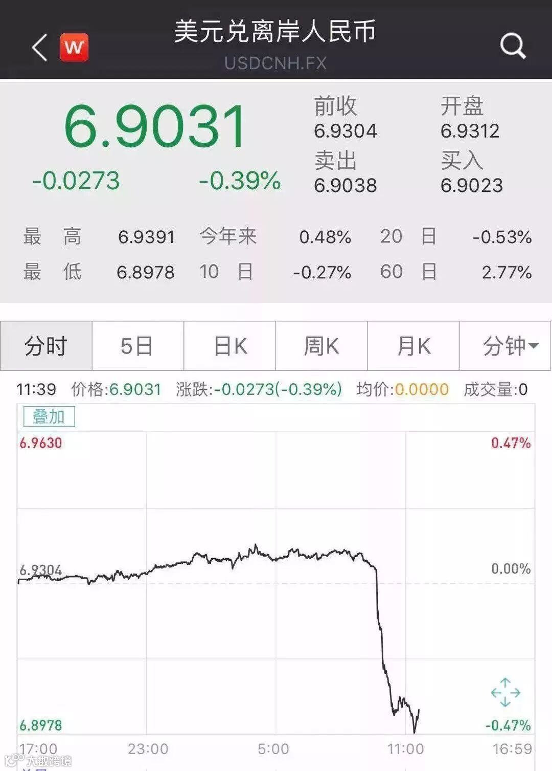 昨天21时30分左右,离岸人民币兑美元汇率从6.93一路暴涨,连续升破了6.93、6.92和6.91、6.90关口,最高至6.8978,较日内低点(6.9391)升值超过400个基点。