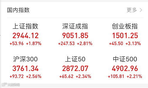 亿万股民静待A股开盘。今日早上开盘,A股总市值上涨超过1万亿元。三大股指全线高开,上证指数大涨1.87%,深证成指大涨2.81%,创业板指大涨3.13%;港股开盘也大涨2.64%。