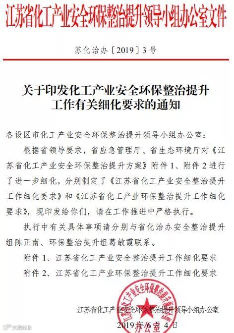 近日,江苏省化工产业安全环保整治提升领导小组办公室发布了一则关于印发化工产业安全环保整治提升工作有关细化要求的通知。