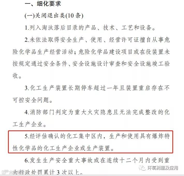 在附件《江苏省化工产业安全整治提升工作细化要求》中明确提出了关闭退出类(10条)、停产整改类(11条)和限期整改类(11条),在其中关闭退出类中提到,将关闭经评估确认的化工集中区内,生产和使用具有爆炸特性化学品的化工生产企业或生产装置。