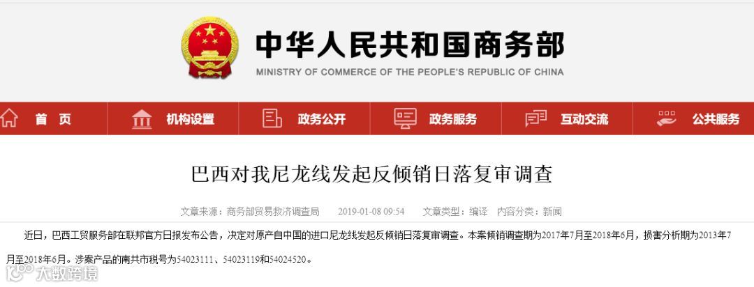 近日,巴西工贸服务部在联邦官方日报发布公告,决定对原产自中国的进口尼龙线发起反倾销日落复审调查。本案倾销调查期为2017年7月至2018年6月,损害分析期为2013年7月至2018年6月。涉案产品的南共市税号为54023111、54023119和54024520。