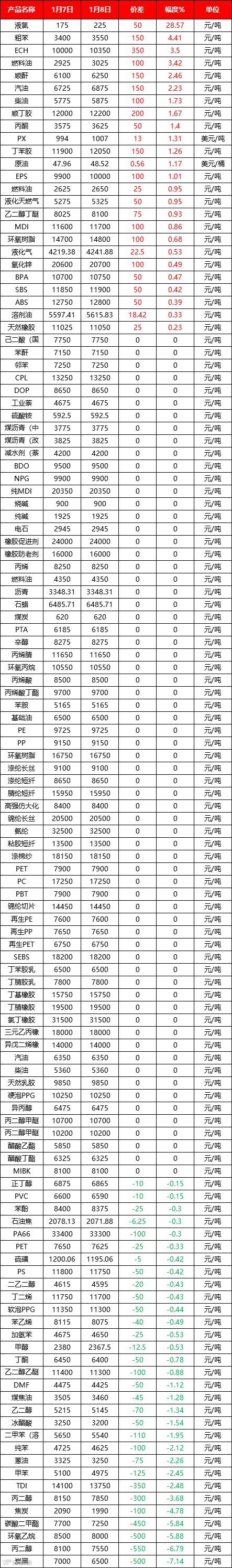 根据小化监测的123个产品之中,有25个产品上涨,占20.49%,67个产品持稳,占54.92%,31个产品下降,占25.41%。液氯、粗苯、ECH,涨幅分别28.57%、4.41%、3.5%,下跌产品前三名分别是炭黑、丙二醇、环氧乙烷,跌幅分别7.14%、6.79%、5.88%。